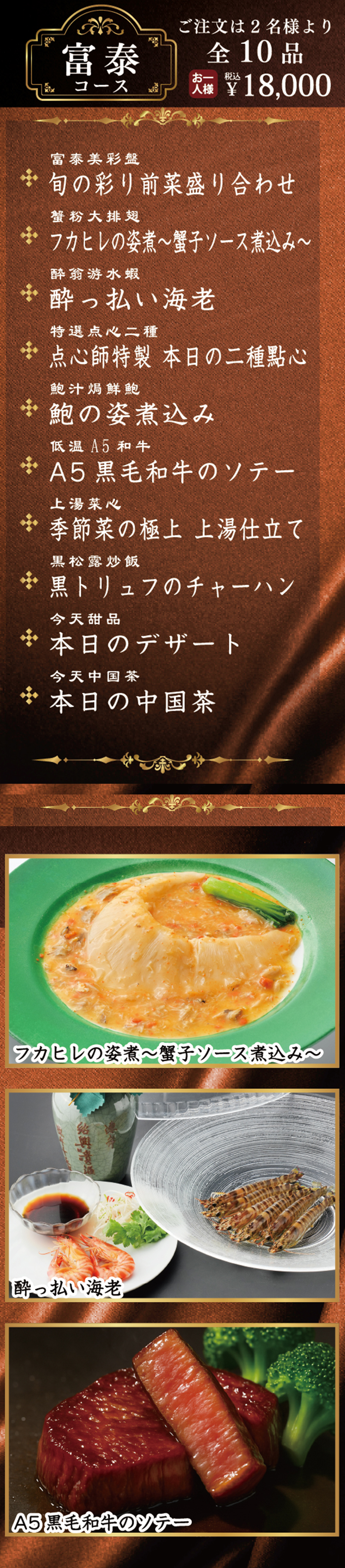 極上の美食コース!鮑やフカヒレ姿煮などの豪華食材をふんだんに使用した、当店の最上級のコースです。